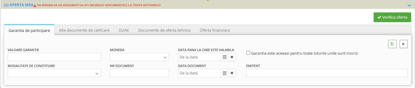 În ecranul de depunere ofertă va fi adăugat un ”tab” nou ”Garanție participare” care va permite ofertantului să completeze detaliile garanției de participare și să încarce fișiere prin care să demonstreze că a constituit garanția.